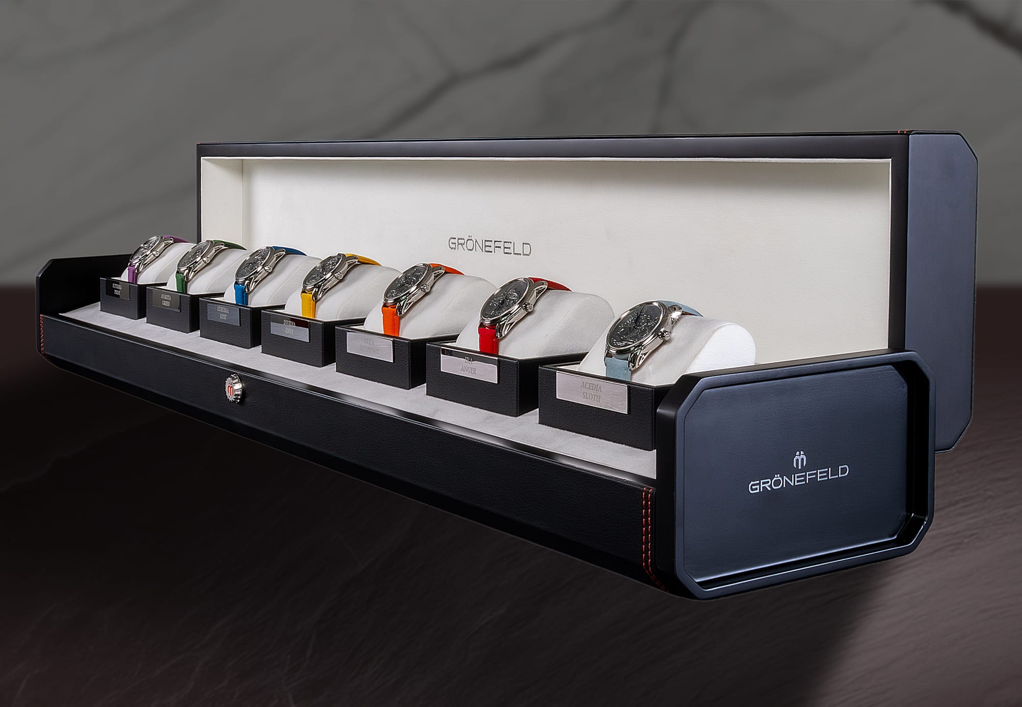 Across the seven, the colour programme was discovered rather than devised. The Gronefelds searched the iconographic tradition and found that specific colours had been attributed to each sin for centuries, rooted in the same moral theology that produced Evagrius's logismoi and Callot's playing-card figures. The result is an object that carries its programme into every element: an engraved dial, an inscribed Latin name, and a strap visible around the wrist. A person who knows the tradition reads all three simultaneously. A person who does not know the tradition knows only that the watches are beautiful and distinct. The system works at both levels of attention.