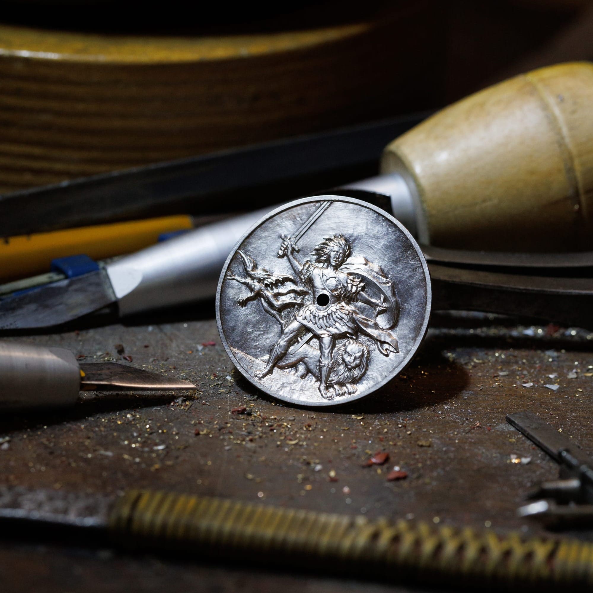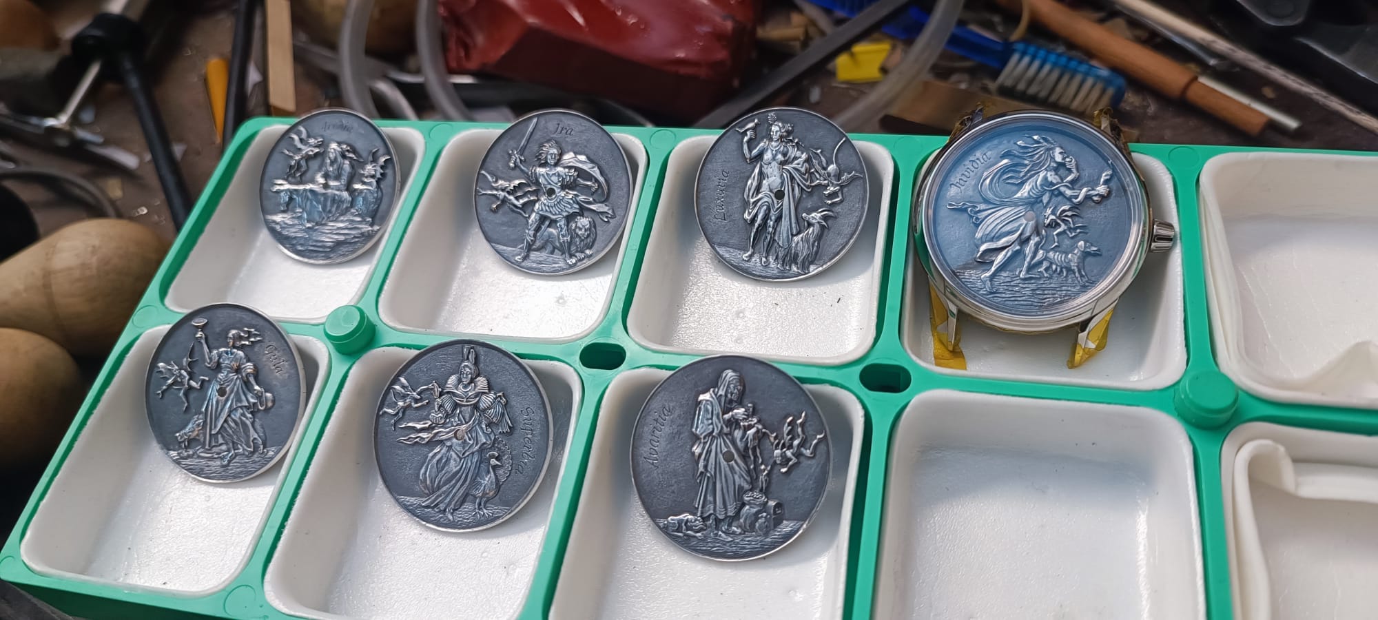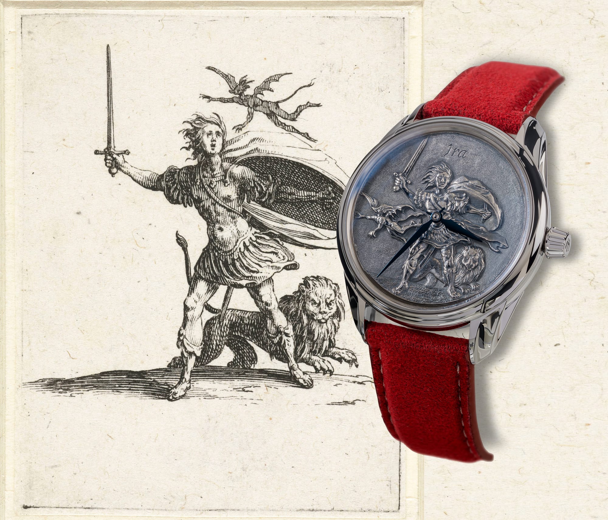 The translation problem was specific to each of the seven. Callot's prints are rectangles. A watch dial is a circle with a centre that pulls, a perimeter that curves, and zones of visual tension that a rectangle does not. Every element that falls outside the circle must move inside it or be abandoned. Every line Callot achieved through the pressure of the échoppe must be restated in relief, metal raised above the field, read as illumination and shadow in three dimensions rather than ink pressed into recessed lines on paper. The calibration is different for each of the seven, and the differences are instructive.