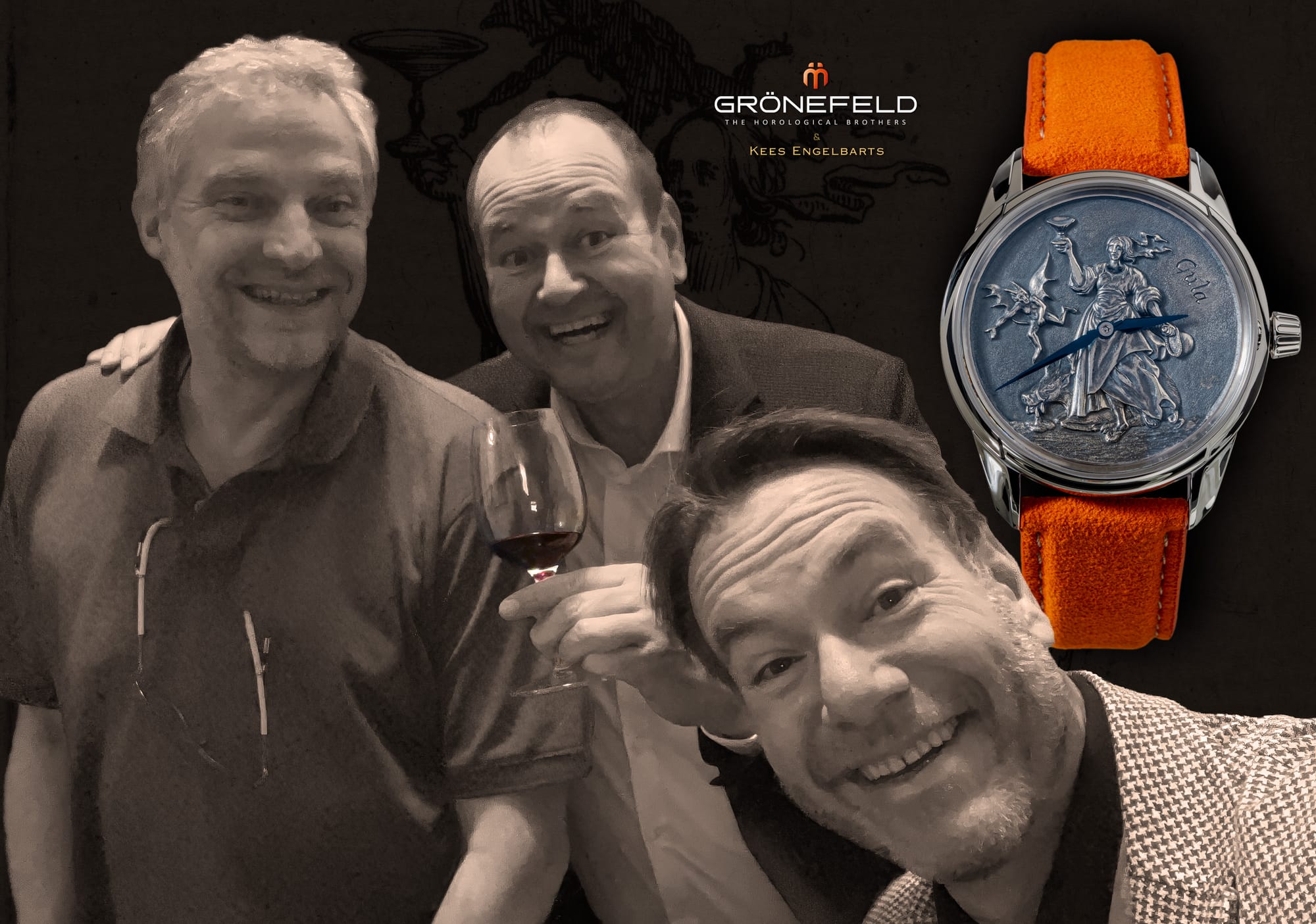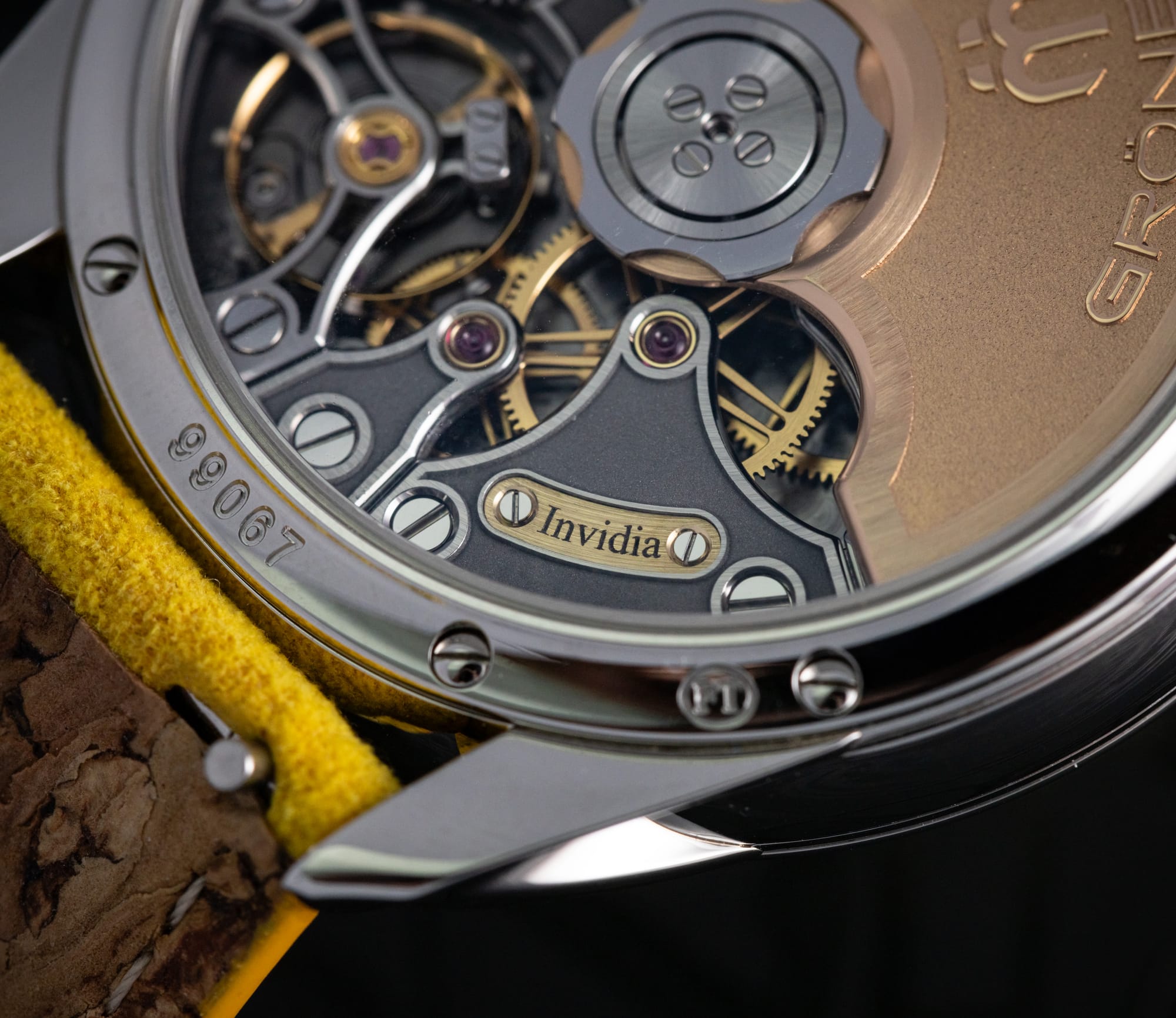 Beneath each of the seven scenes, Gronefeld's automatic Calibre G-06 runs with the same commitment to craft that Engelbarts brought to the surface above it. The movement's stainless-steel bridges are finished by hand and shaped in reference to the stepped gable facades of traditional Dutch architecture, a piece of cultural autobiography from two brothers who have spent their working lives in a tradition not their homeland's. The jewels are set in gold chatons, the bevelling done by hand to a brilliant finish. A gold plate on the movement names the sin depicted by the dial above it. The object is coherent from the outside in.