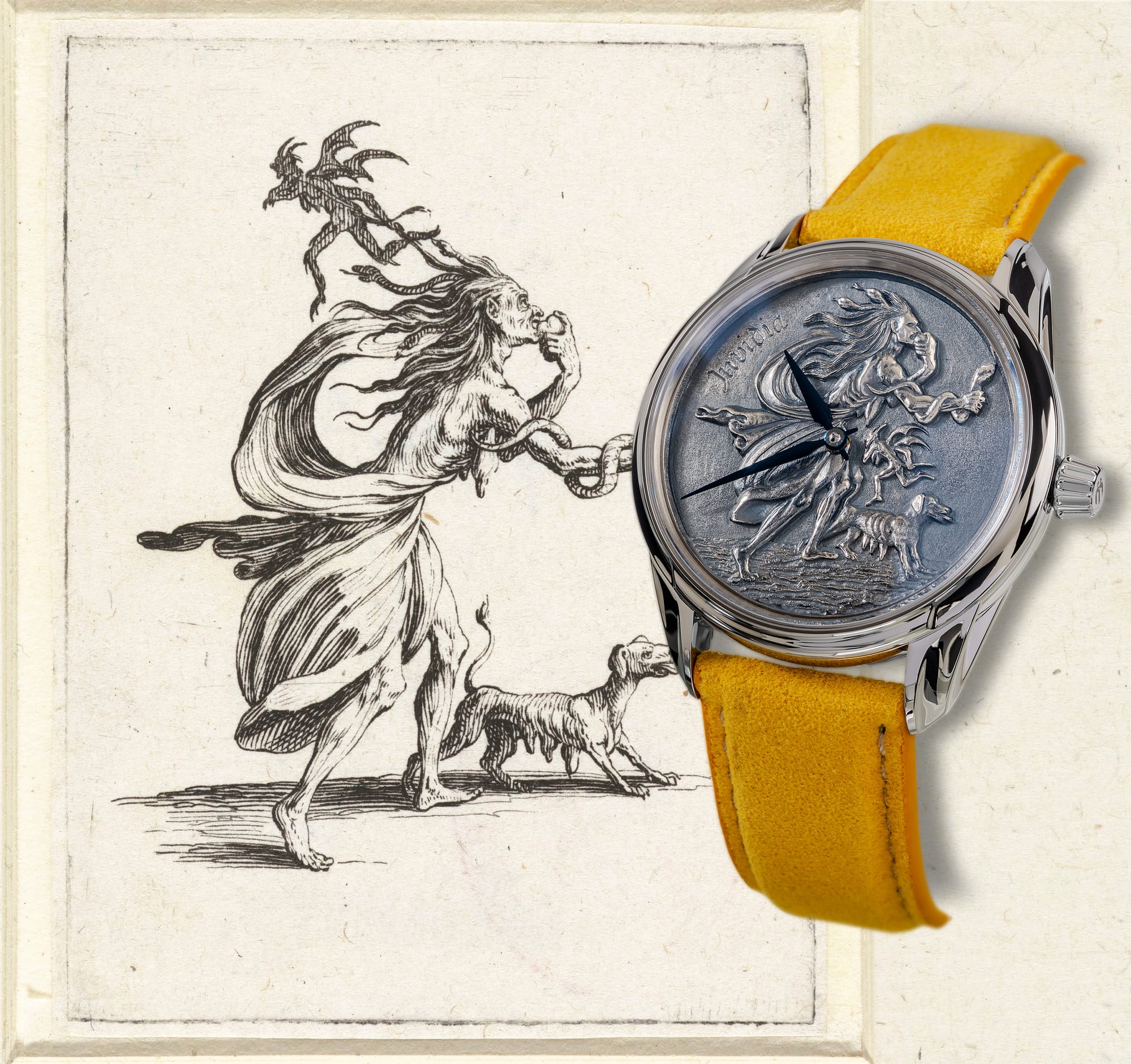 On the dial, Engelbarts has repositioned the demon to the figure's right side, physically separate and no longer pulling at her, the external torment of Callot's original replaced by a lateral presence. The snake and the hound survive, the emaciation survives in attenuated form, but the specific violence of Callot's image, a figure being undone from above, is resolved into something more composed. What Callot achieved through assault, Engelbarts restates through confrontation. Yellow for the strap: jaundice, the yellowing of resentment, a tradition running from antiquity through the medieval moralists.