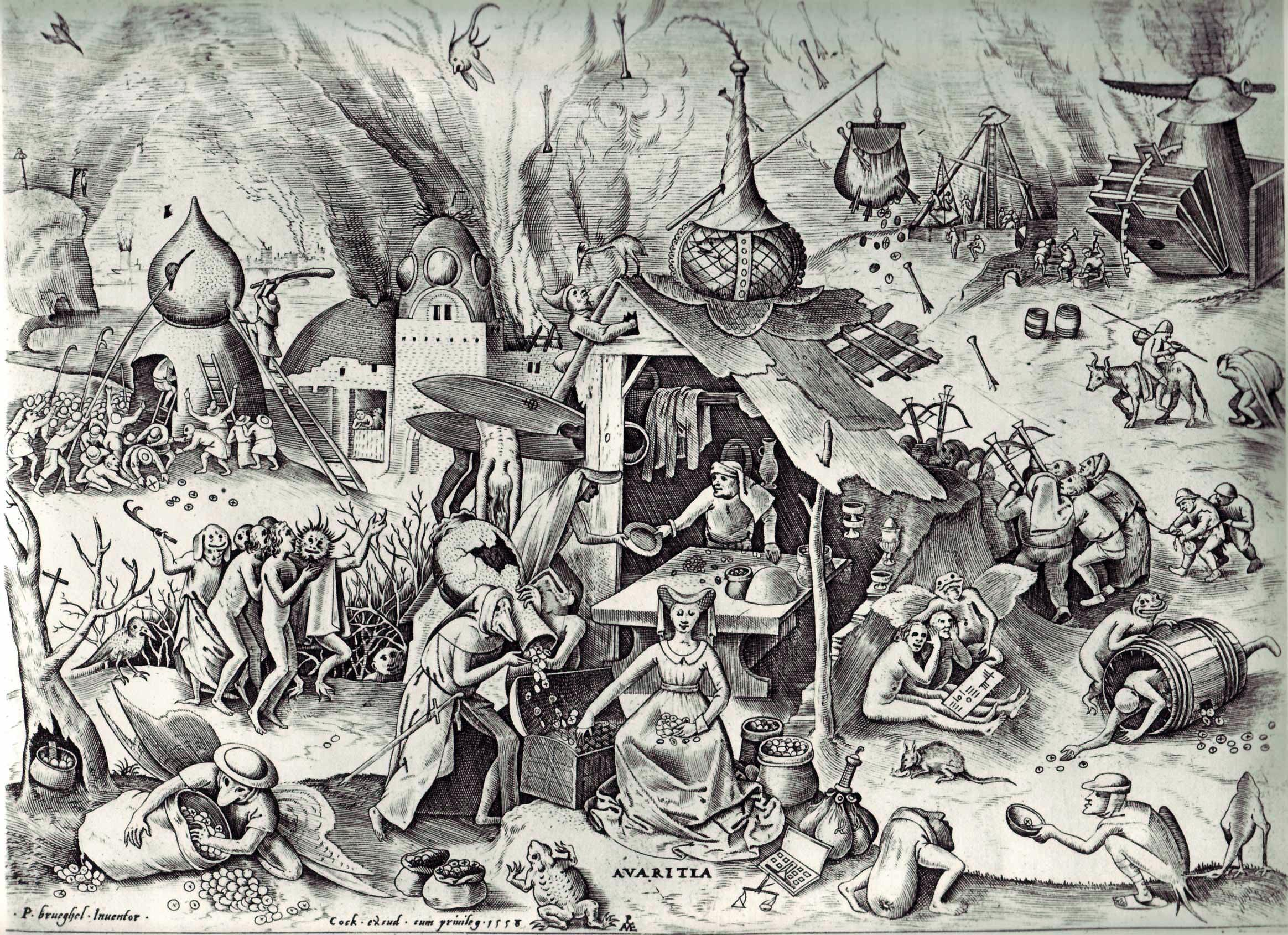 Hieronymus Bosch arranged the sins as scenes from daily Netherlandish life in a circle representing the eye of God: wrath as a tavern brawl, greed as a corrupt judge, pride as a woman before a demon-held mirror. Pieter Bruegel returned them to the printmaker's medium in the 1550s, populating his compositions with hybrid demons and deformed figures in scenes of social disintegration. Both men worked at scale and in crowds. Their sins inhabit worlds, environments of consequence, populated by victims, bystanders and demons in architectural relationship with one another. When Callot came to the subject, he did something the tradition had not quite done before. He made each sin a single figure, alone.