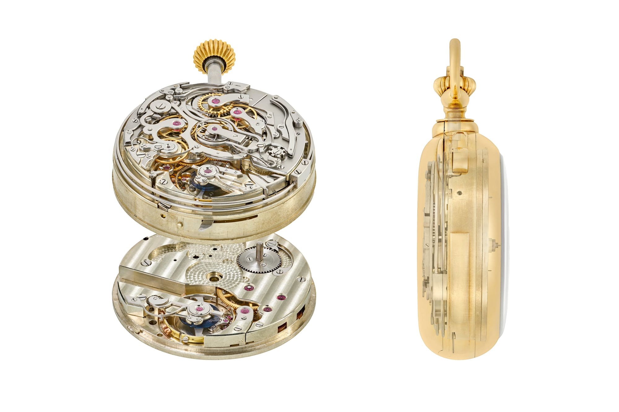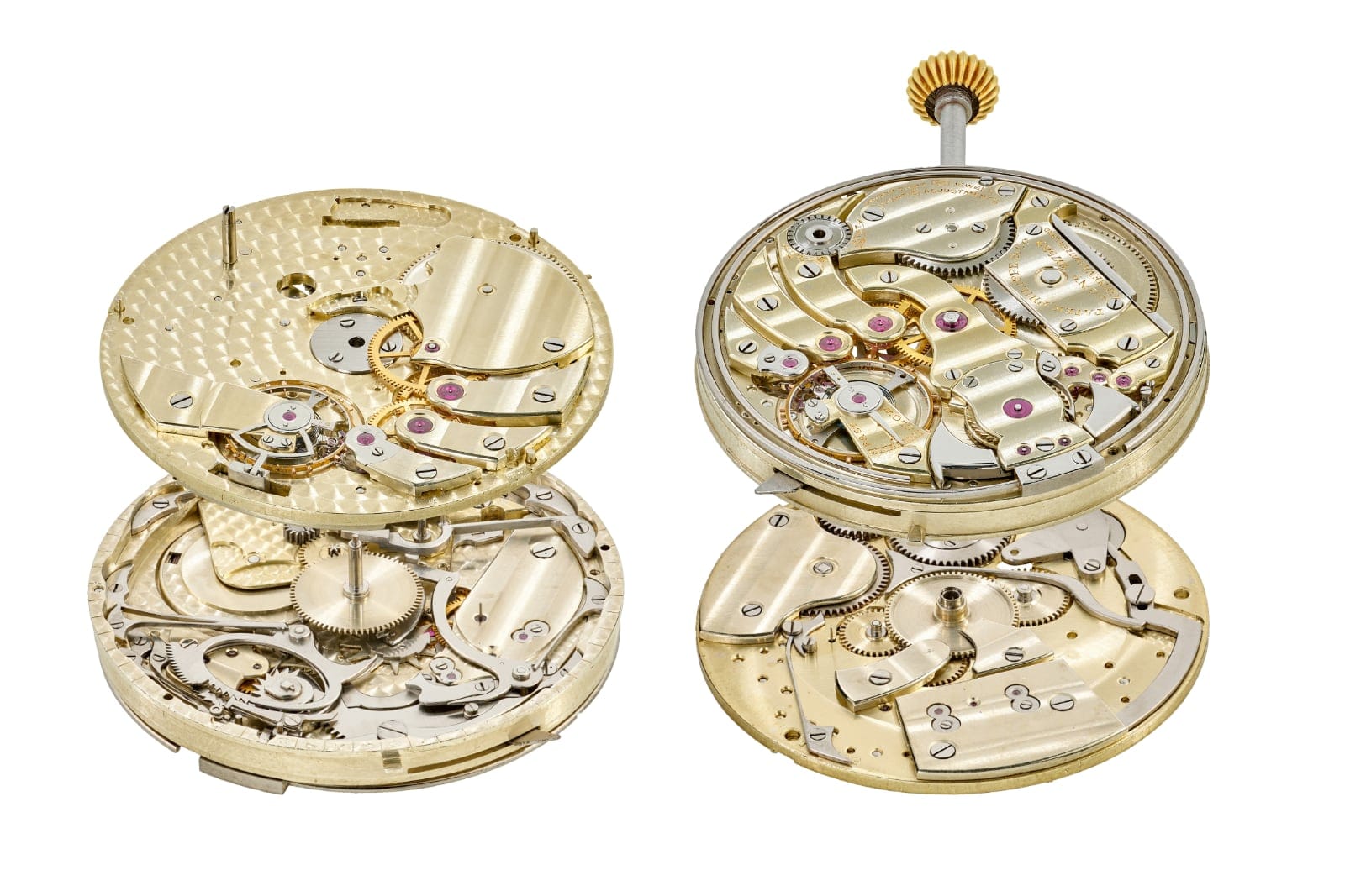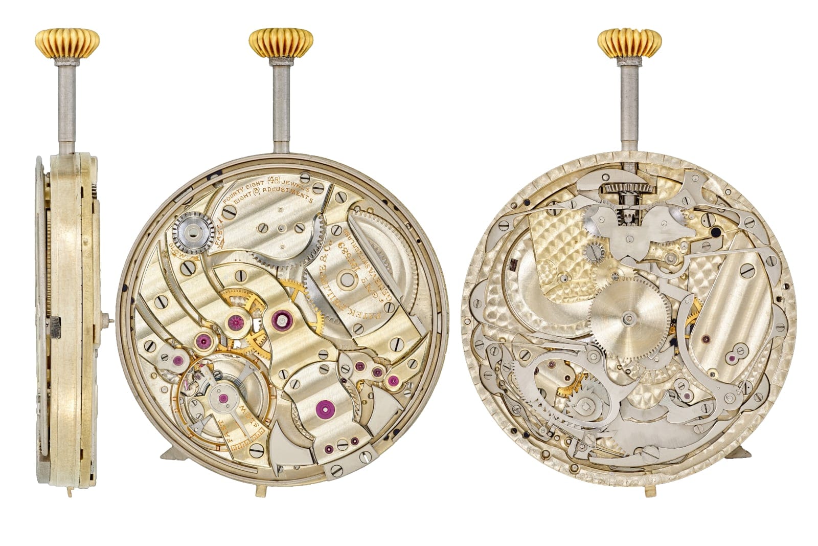 The gear ratio required to express this differential within a single movement, 365.25/366.25, was technically achievable but would have introduced compounding errors over time. Morehead and Patek Philippe chose instead to build and integrate two movements, each doing what movements do perfectly well, running independently: one tracking solar time, one sidereal, the relationship between them visible in the gradual divergence of the two sets of hands. The 1920 minute repeater, the earlier and slightly simpler of the two pieces, confirms this function explicitly in its Sotheby’s catalogue description: the gold hands indicate sidereal time, the blue hands a standard 24-hour day. The 1924 split-seconds chronograph with minute repeater adds further complication to the same essential architecture.