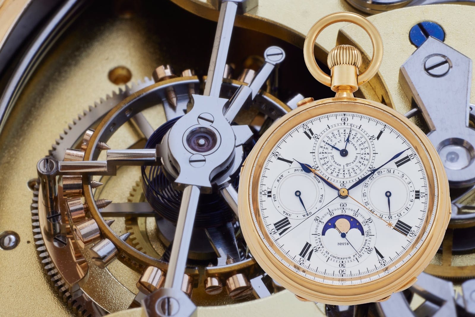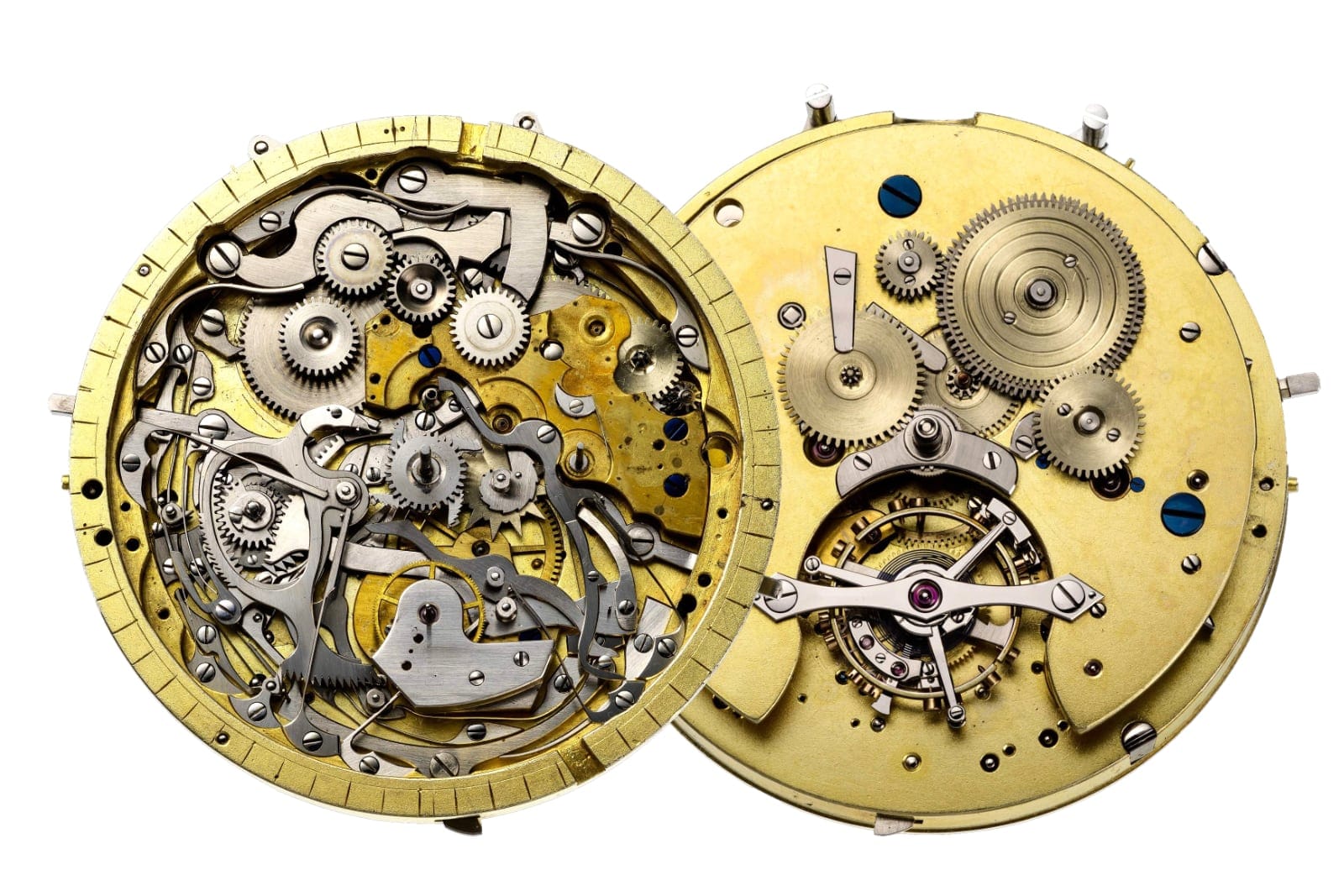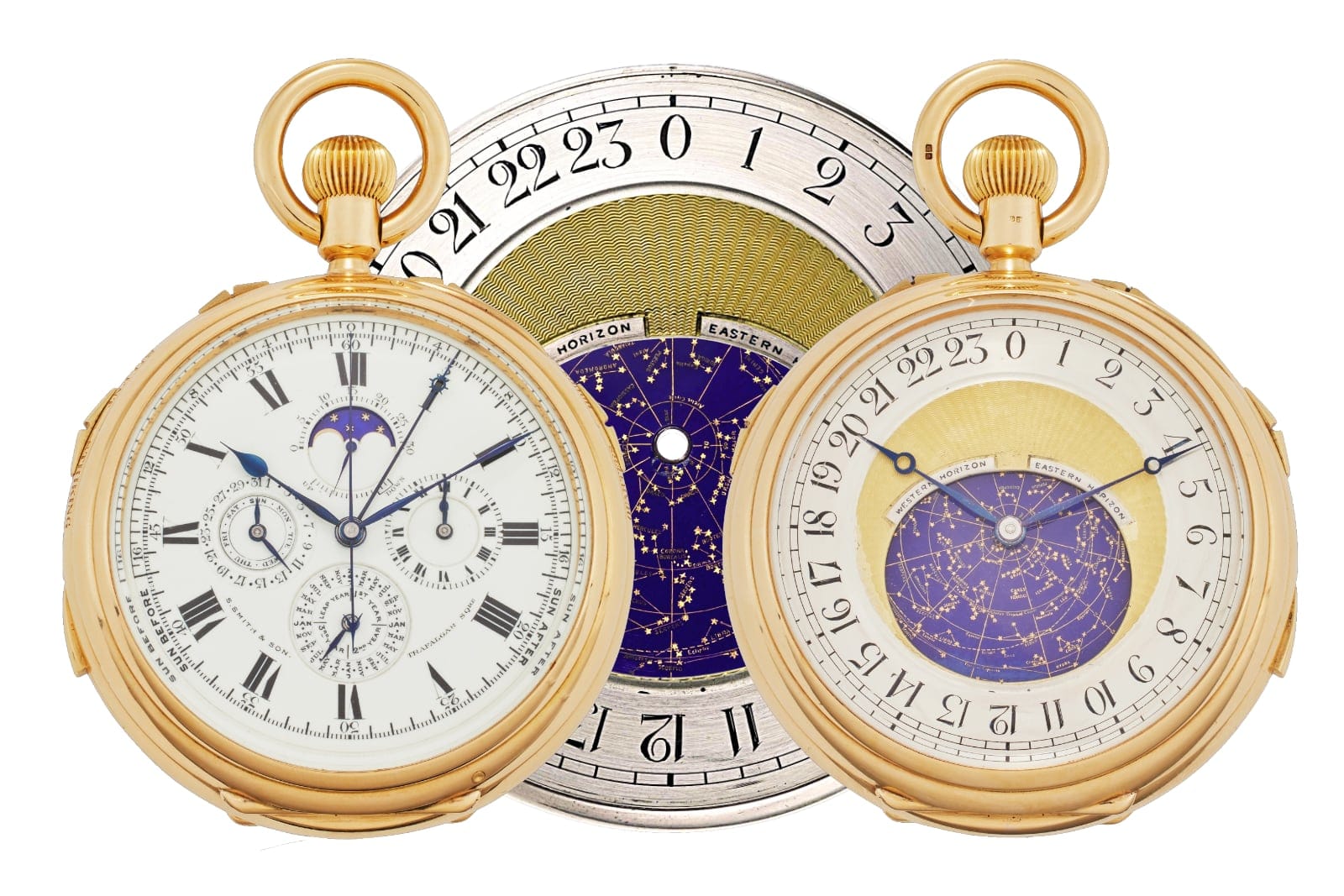 The gear ratio required to express this differential within a single movement, 365.25/366.25, was technically achievable but would have introduced compounding errors over time. Morehead and Patek Philippe chose instead to build and integrate two movements, each doing what movements do perfectly well, running independently: one tracking solar time, one sidereal, the relationship between them visible in the gradual divergence of the two sets of hands. The 1920 minute repeater, the earlier and slightly simpler of the two pieces, confirms this function explicitly in its Sotheby’s catalogue description: the gold hands indicate sidereal time, the blue hands a standard 24-hour day. The 1924 split-seconds chronograph with minute repeater adds further complication to the same essential architecture.