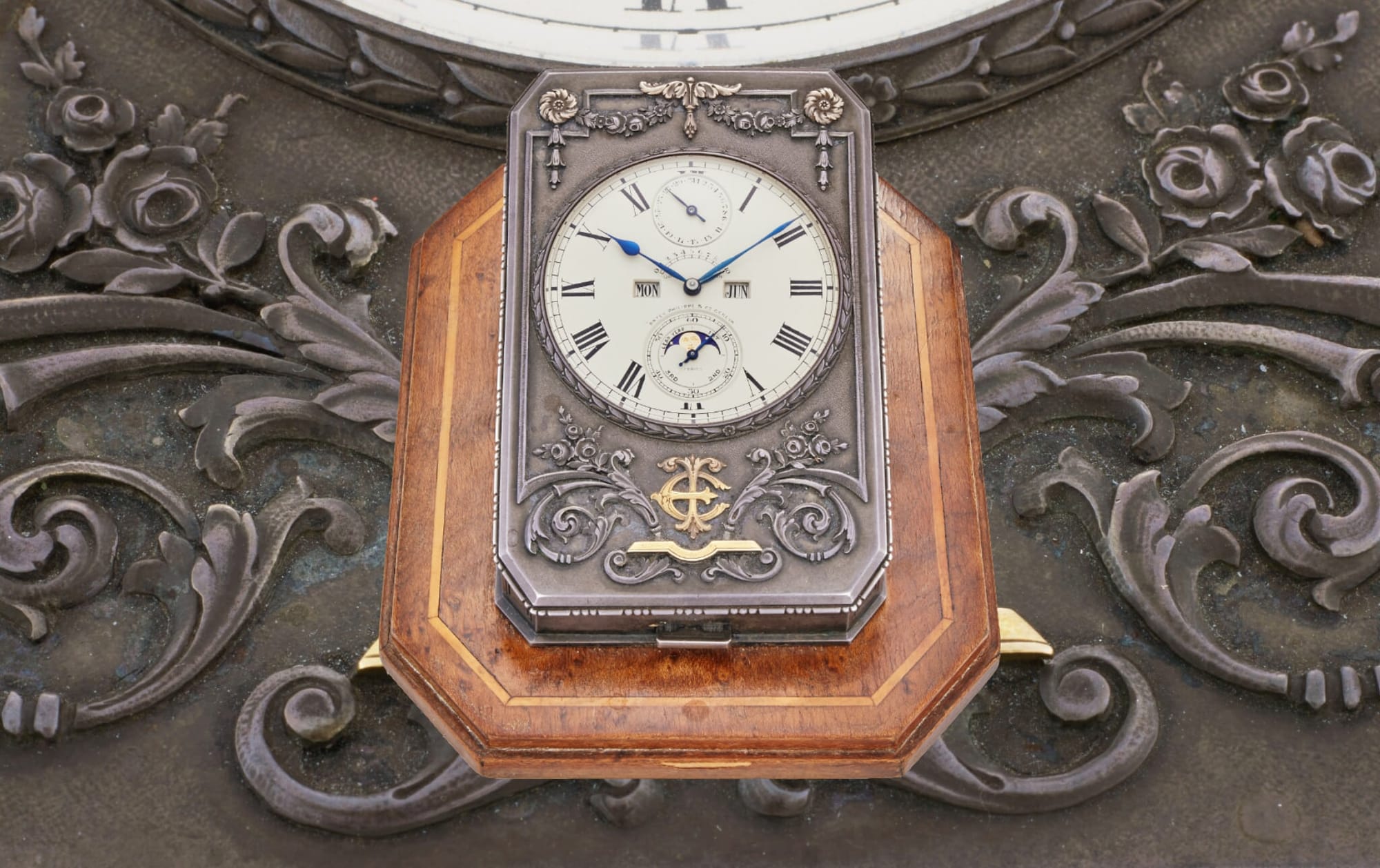 The clock shows perpetual calendar, moon phases, and a ten-day power reserve indicator. It is mounted on a wood base and housed in an engraved silver case of considerable ornamental sophistication. The movement carries one further distinction: a diamond endstone for the balance, a refinement absent from both the Graves and Packard examples, and one that Patek Philippe reserved for its most exceptional commissions. In April 2025, several months before the Olmsted auction, Patek Philippe presented a new complicated desk clock at Watches & Wonders in Geneva, inspired by the historic Packard and Graves examples. Its reception underlined the contemporary appetite for pieces of this lineage and, in a single stroke, established a powerful market context for the original Emery clock.